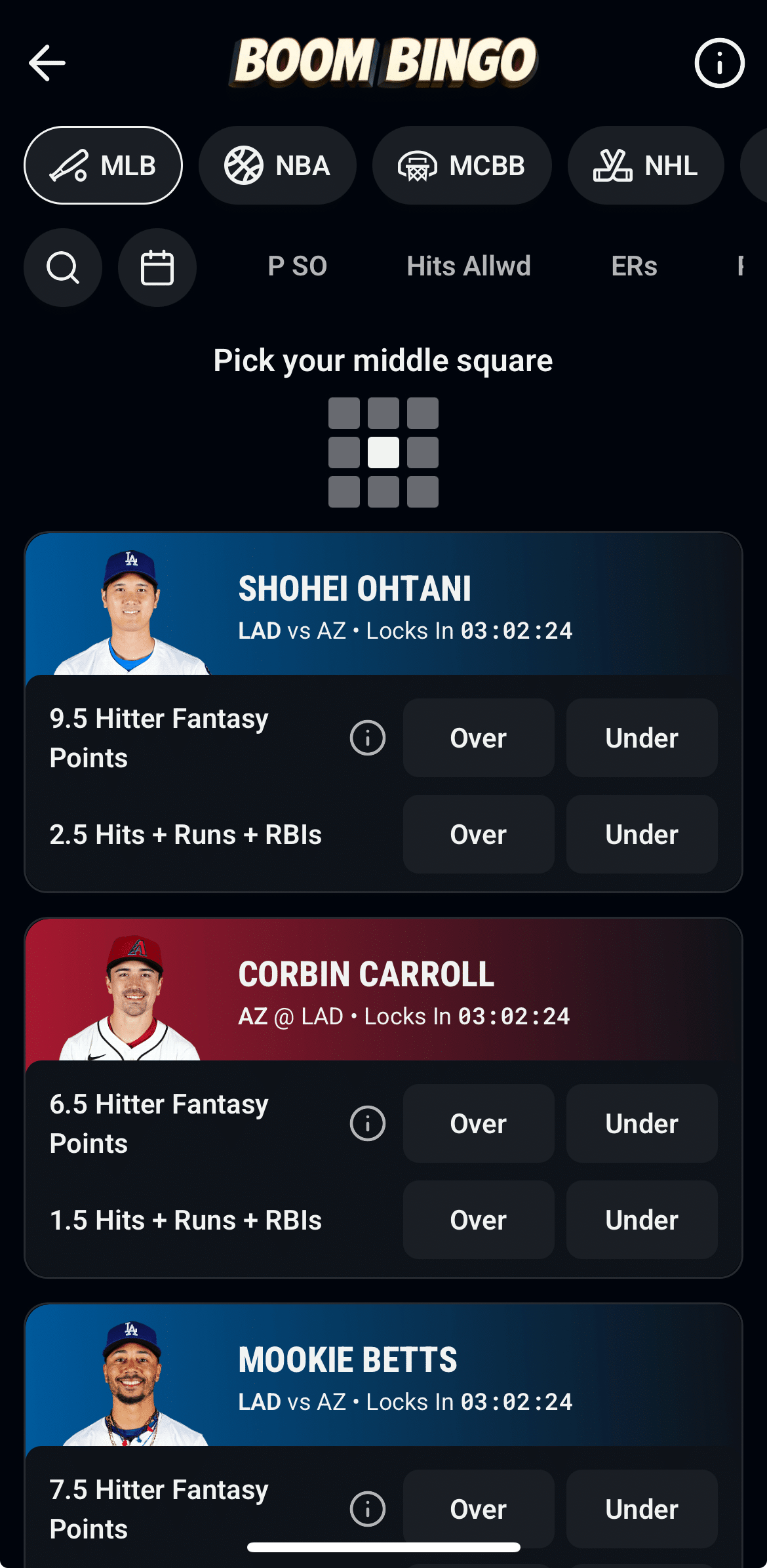 Boom Bingo contests give you a 3×3 board built around sports predictions. In this game type, you choose a center square, and Boom automatically fills the remaining eight squares with questions. If you don’t like the board you receive, you can shuffle for a new board (up to 10 times per session).