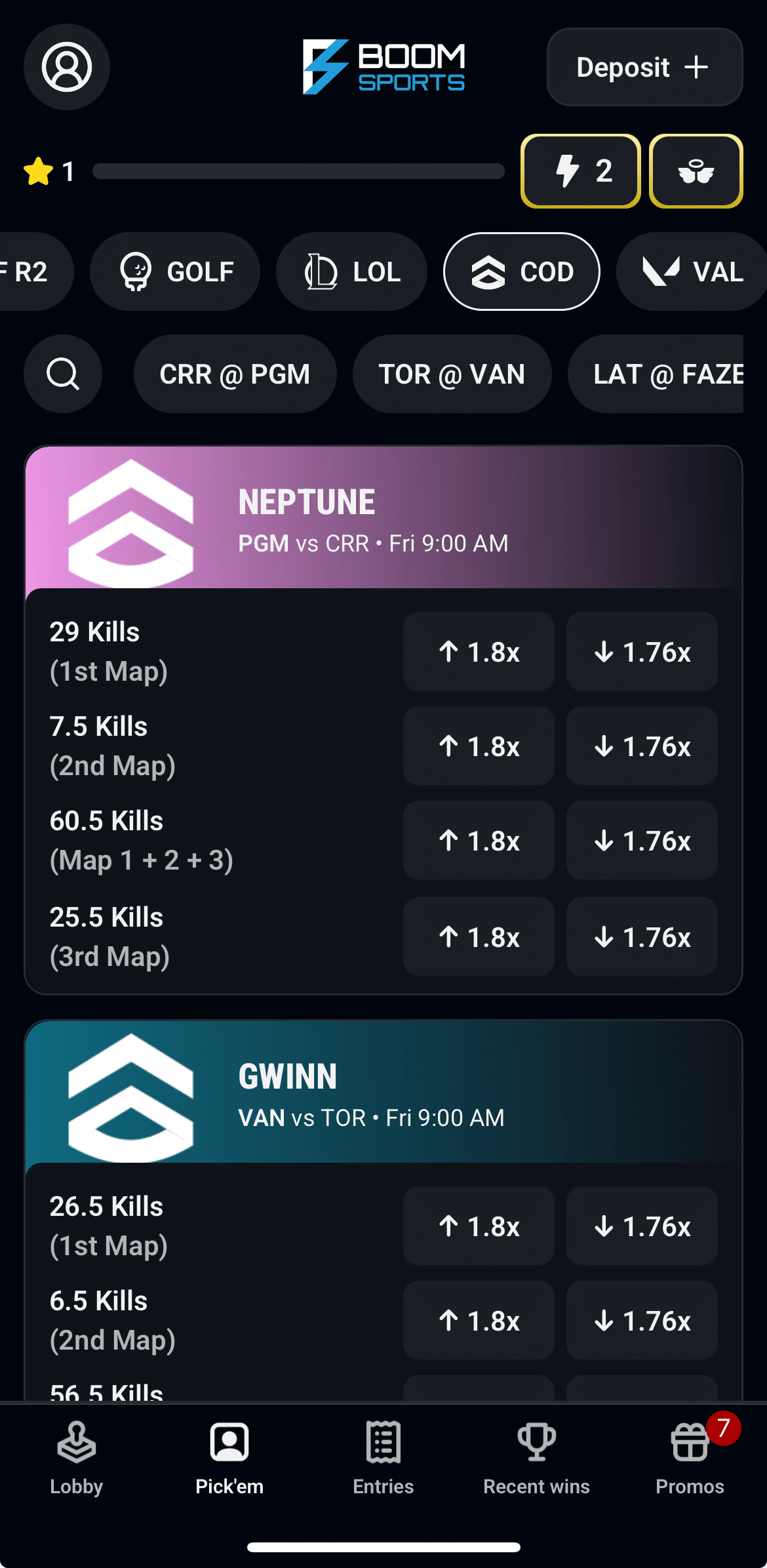 Pick’em Royale is a peer-to-peer variant of Boom’s standard pick ’em contests offered in states that prohibit player-vs-house contests. Pick ‘Em Royale contests still involve over/under predictions, but your entries go into randomly assigned pools of up to 5,000 entries and ranks them on a leaderboard. Prizes from Pick’em Royale pay out in addition to standard entry winnings.