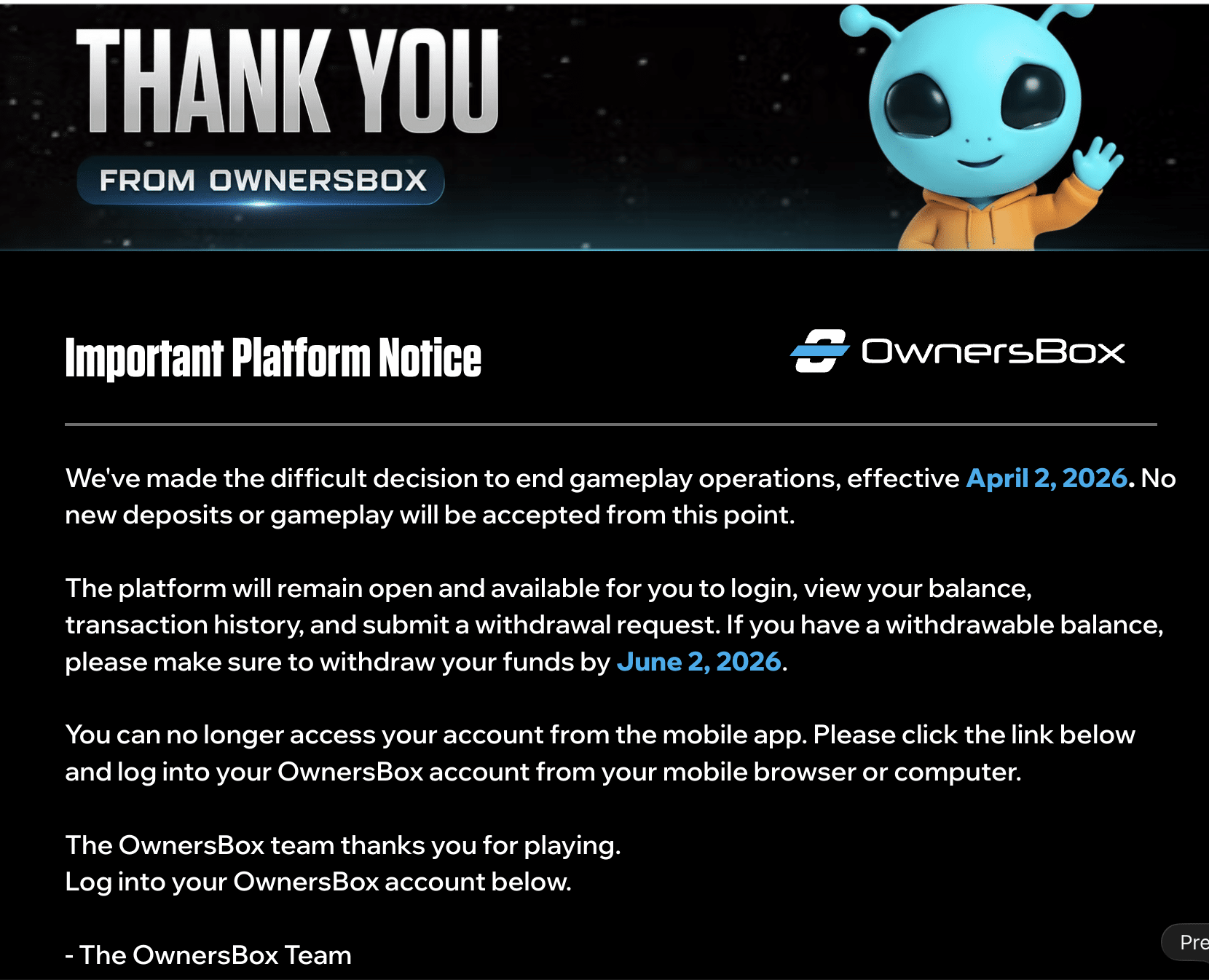 - OwnersBox advises customers not to withdraw their initial deposits. On its terms and conditions page, OwnersBox states that the withdrawal process is meant for winnings and that deposited fund requests are handled on a case-by-case basis.
