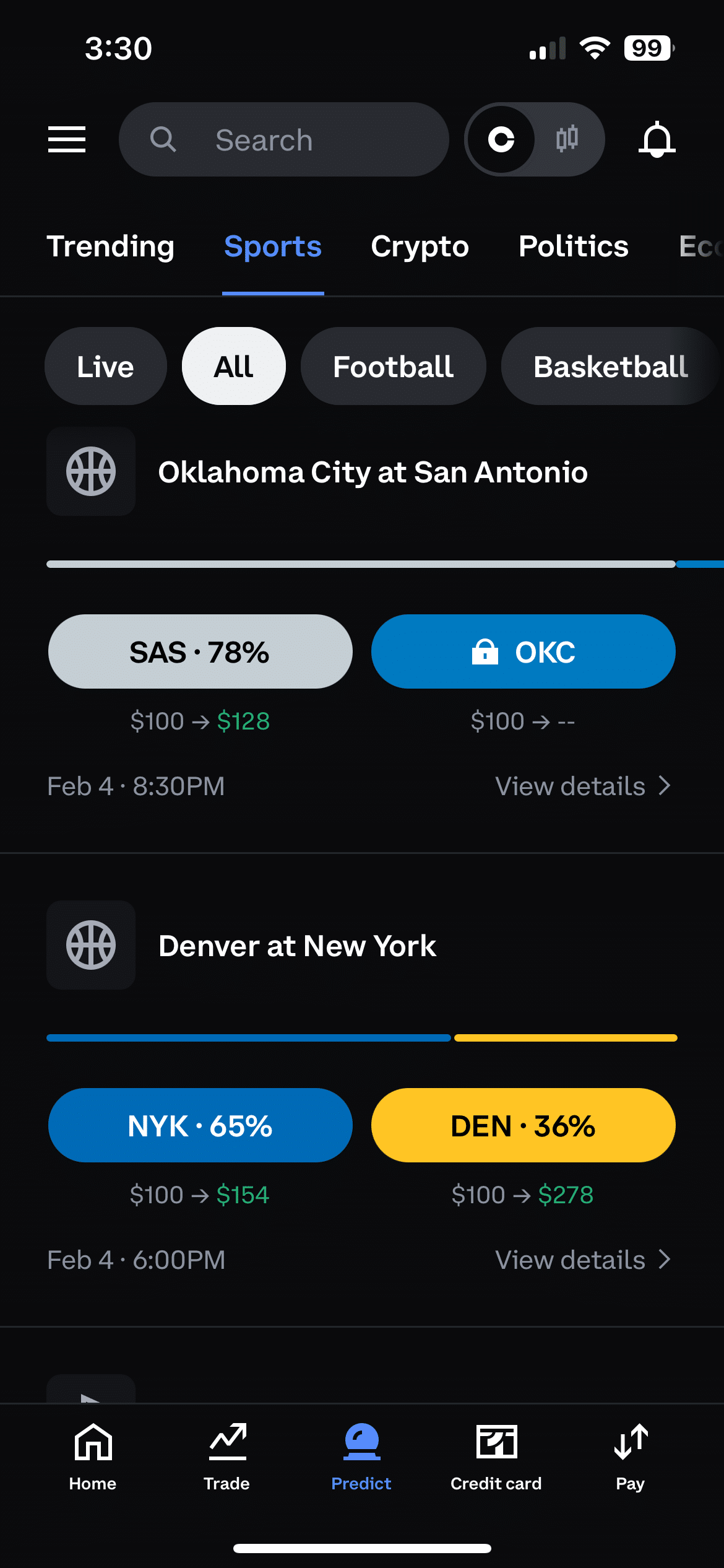 The Coinbase Predict app presents its sports event markets in a way thatโs intuitive for newcomers, stock traders, and experienced sportsbook users alike.