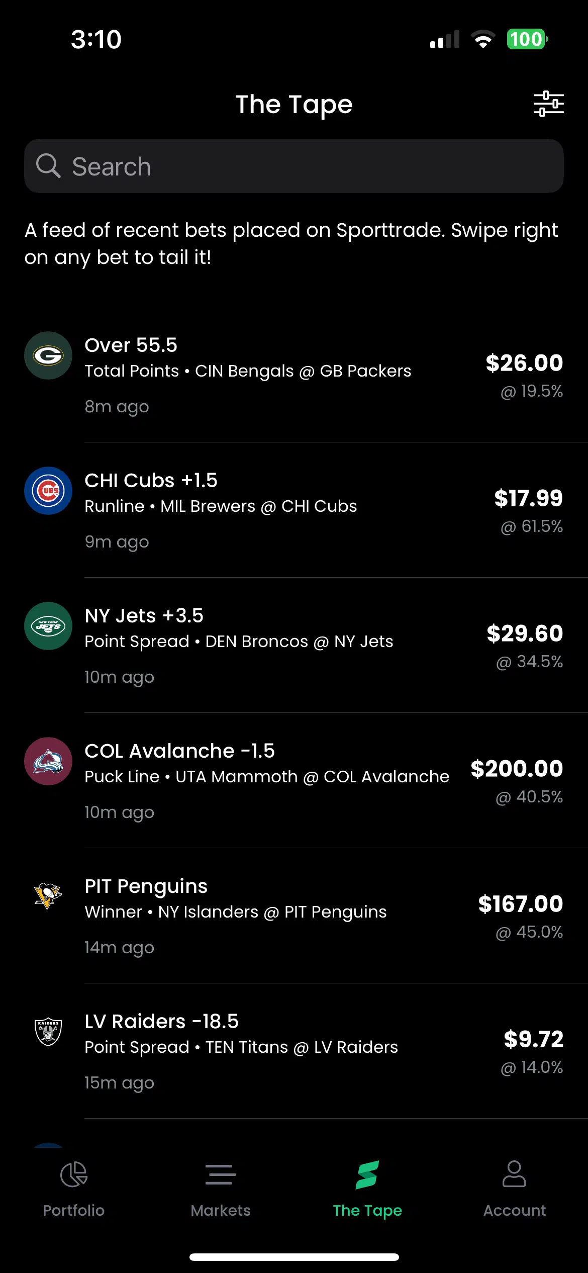 Beginning bettors are best off treating Sporttrade like a conventional sportsbook. They’ll use the app to browse open markets, buy positions established by other players, and sell positions when they feel things aren’t going their way. Selling positions is akin to using a sportsbook’s Cash Out feature, except it’s much more flexible.