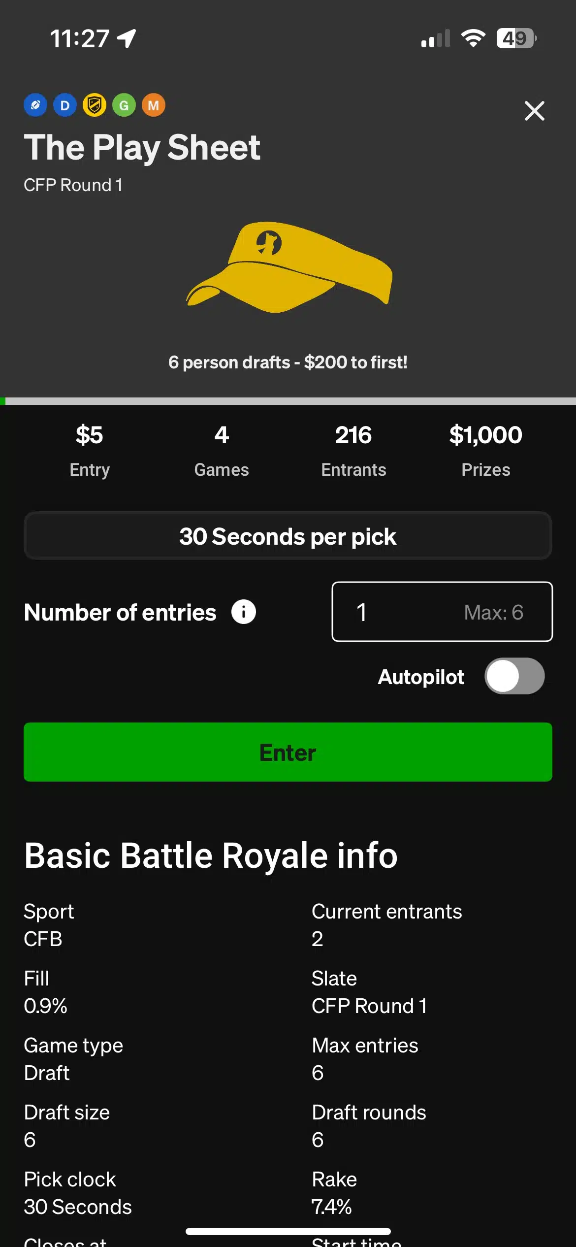 When users select a specific contest, the Underdog app displays all relevant rules and info specific to that game. Among other details, the app also shows how much rake Underdog is taking out of each contest. All the major fantasy operators collect rake, but only Underdog is transparent about it.
